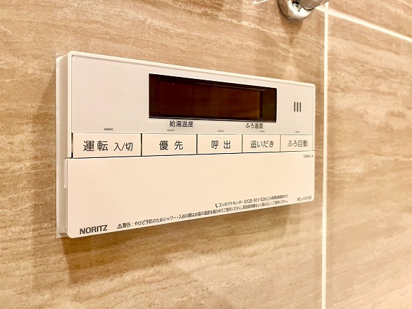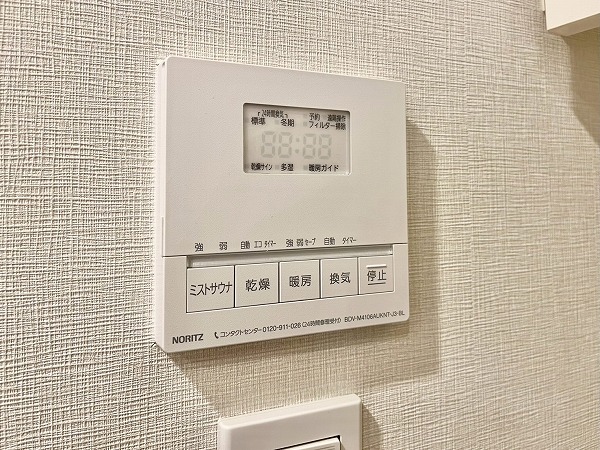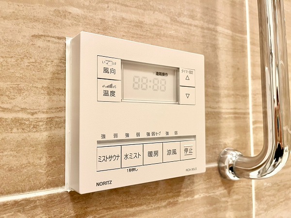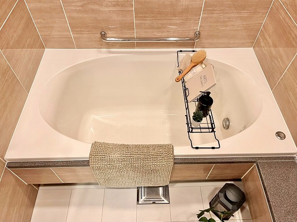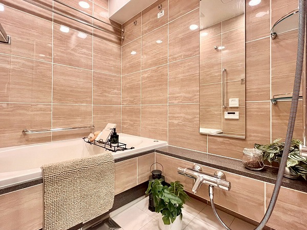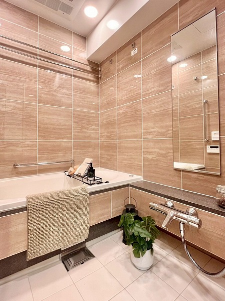 バスルームは艶のあるピンクブラウンのタイルが高級感を演出。楕円形のバスタブが埋め込まれ、自宅にいながらスパにいるような気分を味わえます。浴室乾燥に加えてミストサウナ機能も備わっており、入浴→サウナをセットで行えば、日々の疲れを効果的に癒すことができそうです。