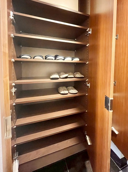 玄関には艶のある石調のタイルが敷かれ、来客者に重厚感と存在感を与えてくれます。オレンジブラウンの扉の中には、家族全員分の靴を並べても余裕のある大容量のシューズボックスを完備。折りたたみ傘やちょっとしたアウトドア用品もしまっておくことができ、玄関周りに余裕が生まれます。