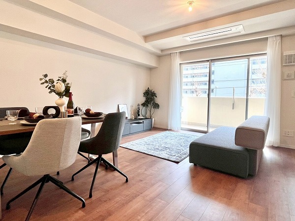 3階に位置する3LDKのお部屋は、レトロチックな温かみを感じる床材と落ち着いた色合いの照明に格調の高さを感じる住まい。南向きの明るいリビングダイニングキッチンは柔らかな日差しに溢れ、2~3人での暮らしにぴったりの上品な空間に仕上がっています。