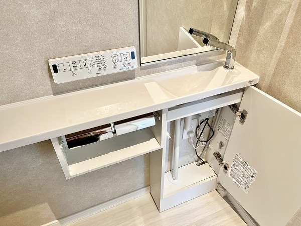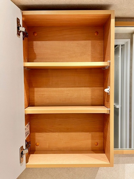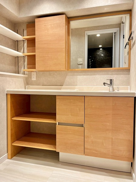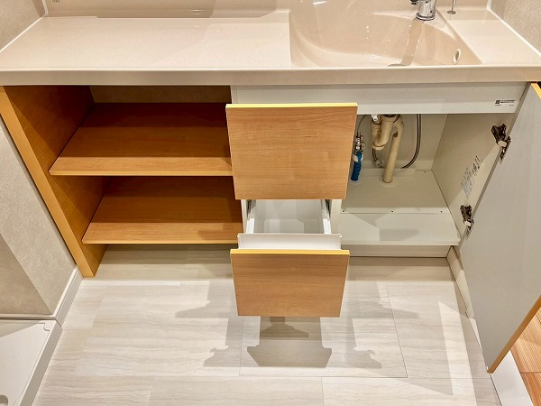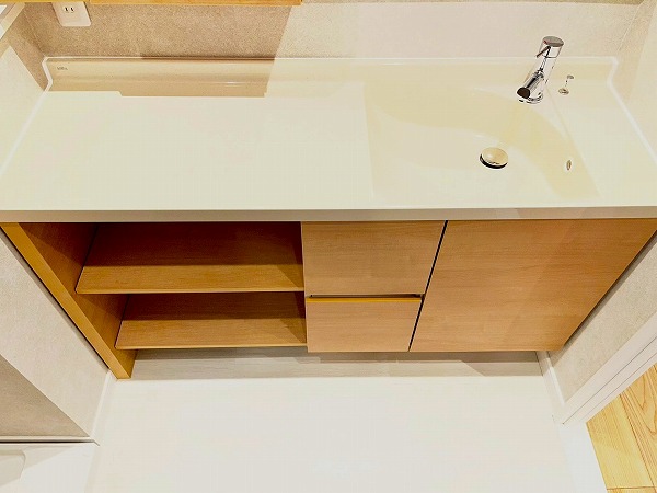 木目調の洗面台は左側のワークトップに余裕を設けることで、よく使うスキンケア用品などはまとめて置いておける仕様になっています。扉付きの収納は空間の雰囲気に合ったデザインでありながら、家族のアイテムをすべてしまっておける収納力が優秀です。