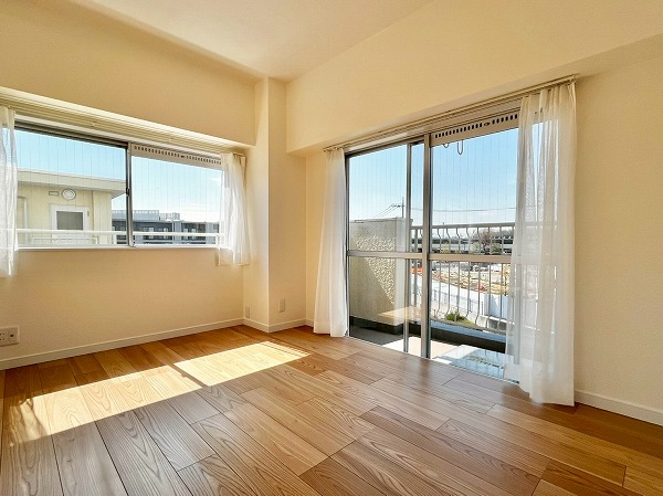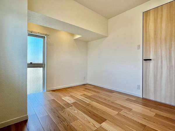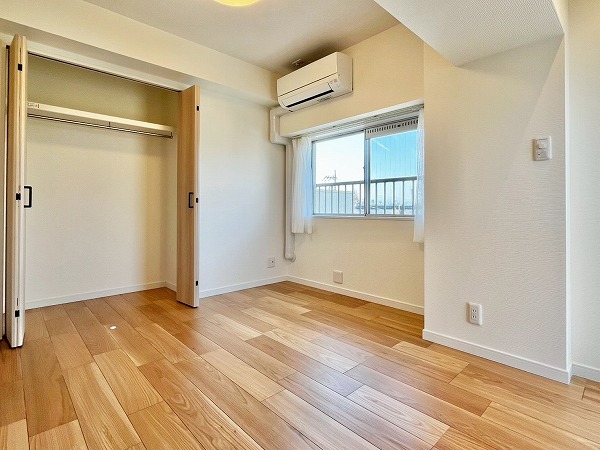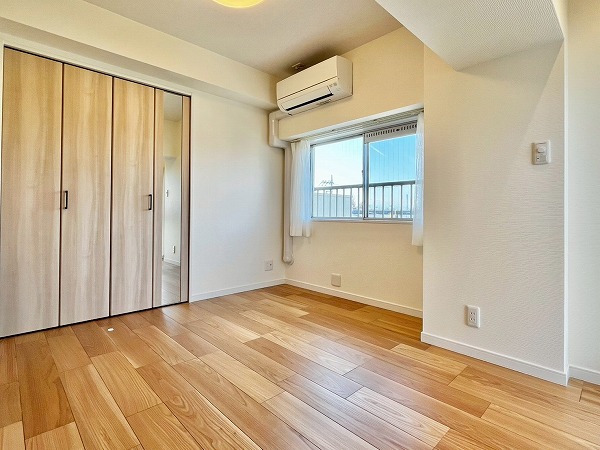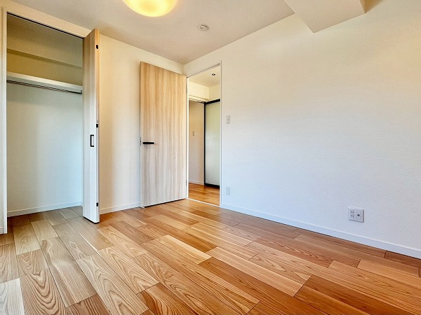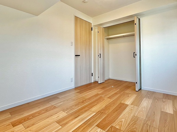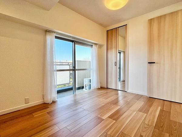 およそ5帖の広さが確保された2つの洋室はクローゼットの前面に鏡がついており、全身のコーディネートを確認しやすいのがポイント。起床~身だしなみの用意までをセットで行え、生活のリズムがすっと整います。西向きの大きな窓が付いて陽当たりも良好◎