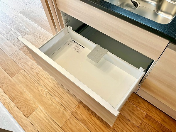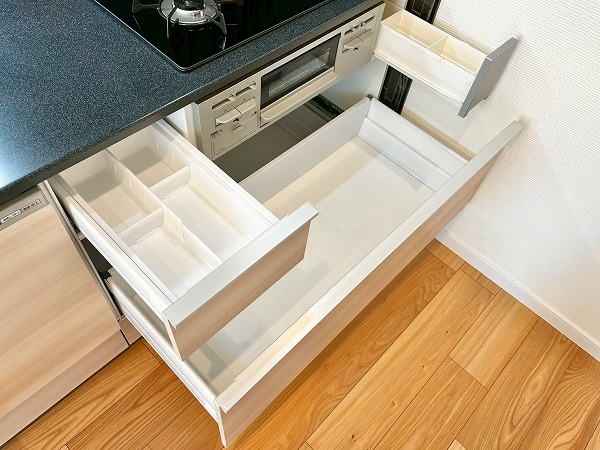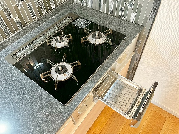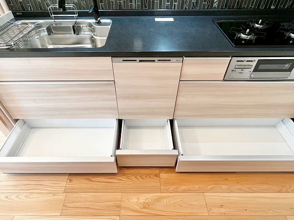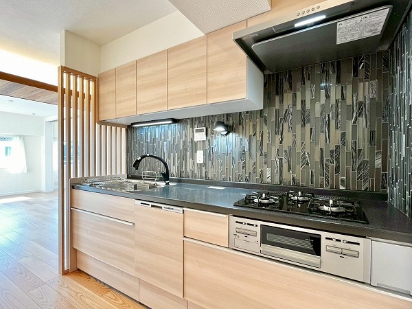 壁付きタイプのキッチンには3口コンロと食洗機を搭載した充実ぶり。手前に設けられた木製のルーバーは室内に抜け感を生み出しながら、お料理空間を上手にゾーニングしています。上下に大容量の収納を備え、鍋やフライパンを複数しまっておけるのがありがたいです。