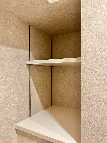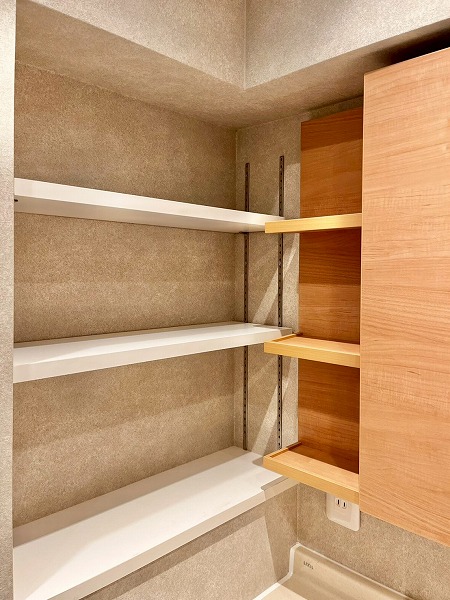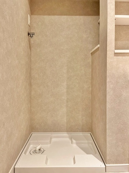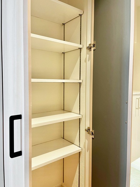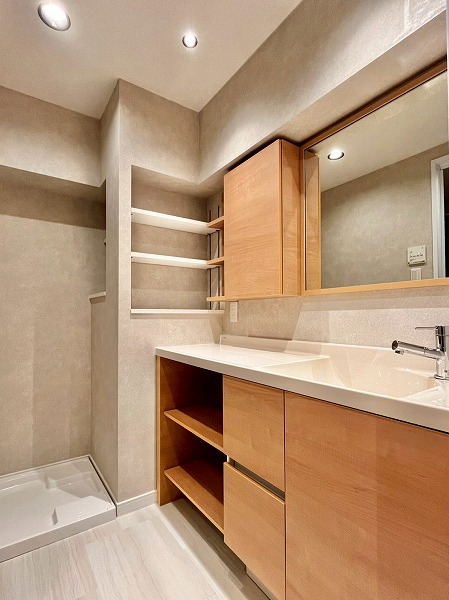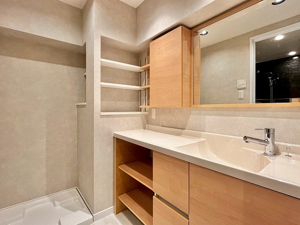 洗面化粧台と可動棚が並ぶパウダールームは、バスルームと洗濯機置き場が近くにまとまっているため、入浴や洗濯がラクラク。日用品も整理しやすく、家事効率もアップ。毎日の生活がスムーズで快適になる空間です!