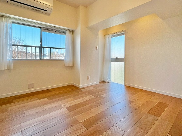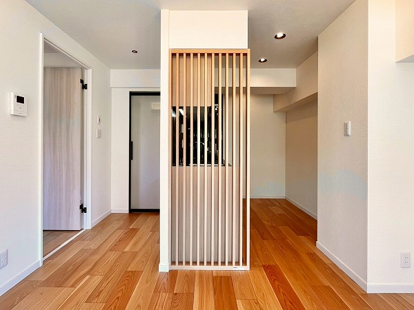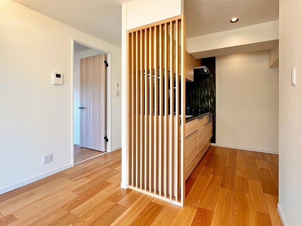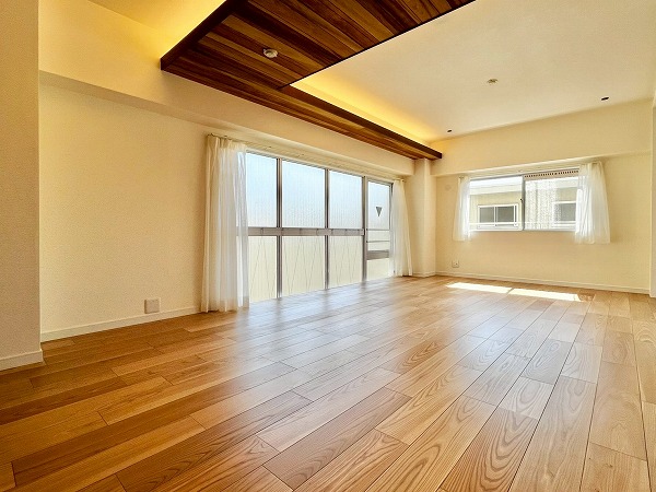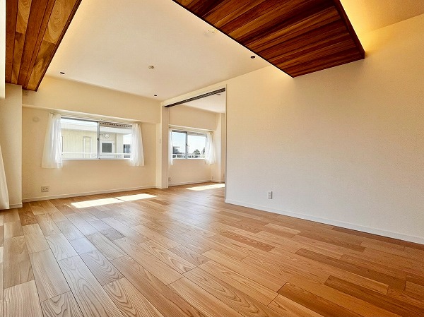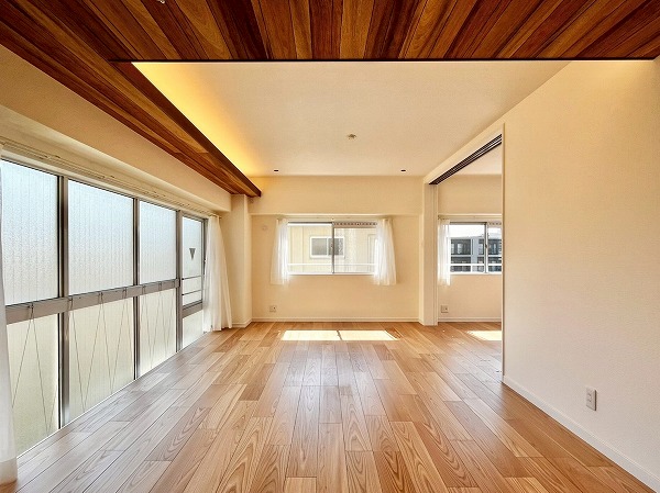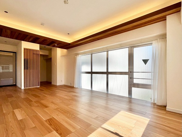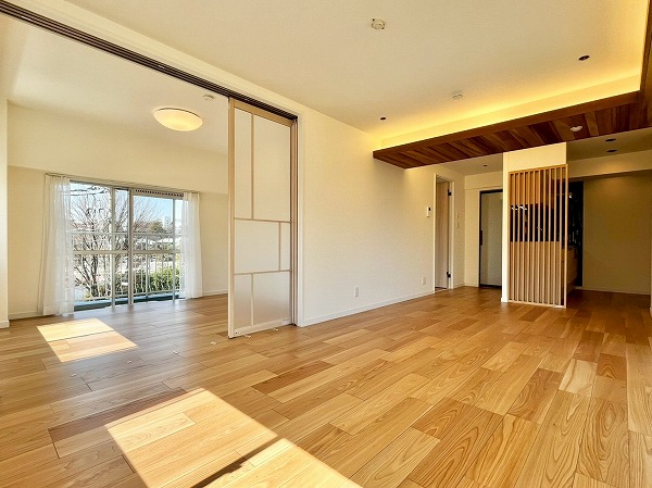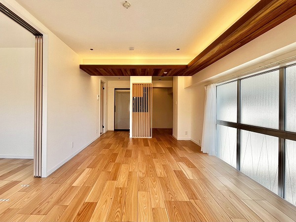 新規リノベーションを終えた3LDKのお部屋は、木の温もりを共通点に各居室がやわらかな和の雰囲気で統一された、落ち着きのある住空間。自然素材を思わせる優しい質感が、帰宅した瞬間からほっと肩の力が抜けるような心地よさを演出しています。3方角部屋につき陽当たり良好なのも嬉しいポイント。窓から差し込む光が室内を明るく照らし、時間帯によって移ろう光の表情も楽しめそうです。