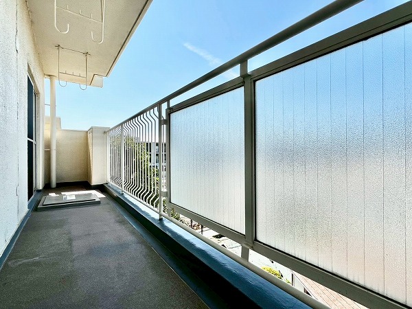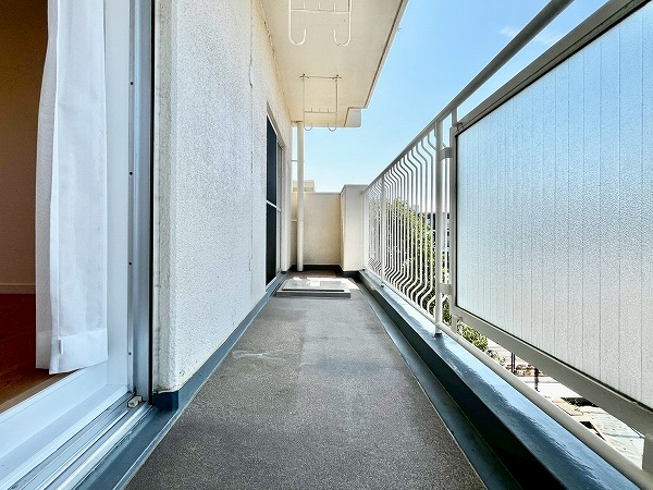 バルコニーの前面には高い建物がなく、空を広く感じる気持ちの良い眺望が広がります。メインルーム内から出入りできる2つの洋室にまたがっており、ワイドな造りでお洗濯物も楽々◎