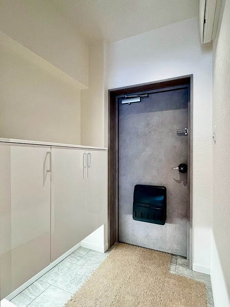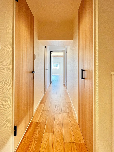 光あふれる玄関には、靴を出し入れしやすい高さにシューズボックスを設置し、日々の使いやすさに配慮しました。上部には鍵や折りたたみ傘などを置けるスペースを確保し、多目的にお使いいただけます。玄関の先には木目調の廊下が続き、和の雰囲気を感じさせる趣あるお部屋の顔を演出。
