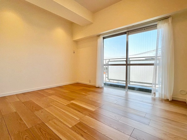 約6.0帖の洋室はリビング横に配置され、スライドドアで空間の広がりもプライベートも自在。クローゼット付きで収納もすっきり。さらにバルコニーに出られるため、朝の陽射しや夜風を感じながら、リラックスタイムを満喫できますよ。