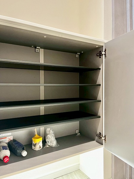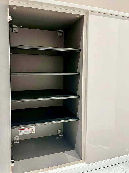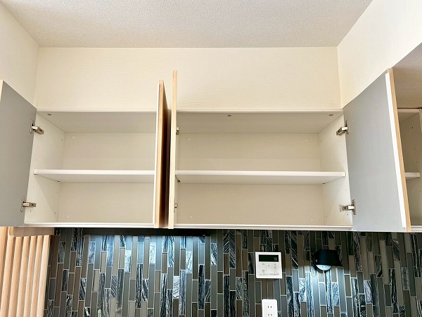 ペニンシュラキッチンは、落ち着いたグレーが空間に馴染みます。カップボードを置けるスペースもあり、収納力は十分。調理中もリビングの様子を見渡せるので、ご家族との時間や来客時のコミュニケーションも自然に楽しめますね✧