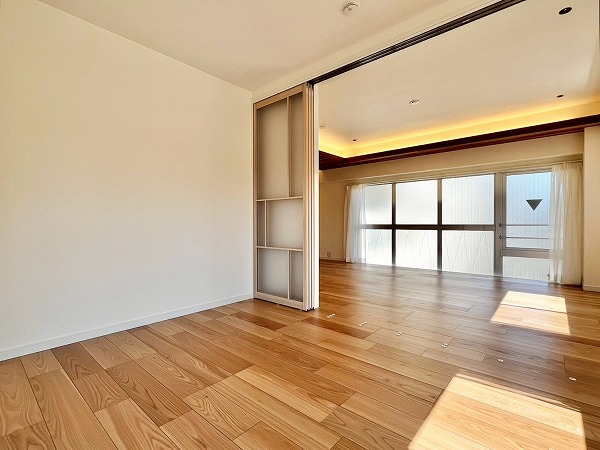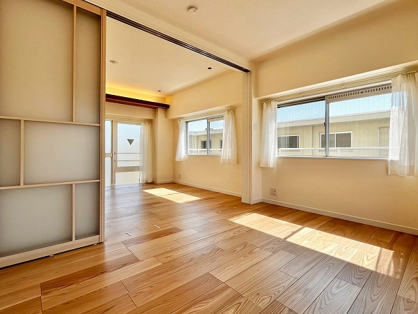 メインルームに隣接する洋室の扉を開け放つことで、東西南の3面採光を実現。1日中太陽の光を確保することで、光に溢れる暮らしが叶います。すりガラスの引き戸は空間を柔らかく分け、自然なつながりを生み出す効果が◎