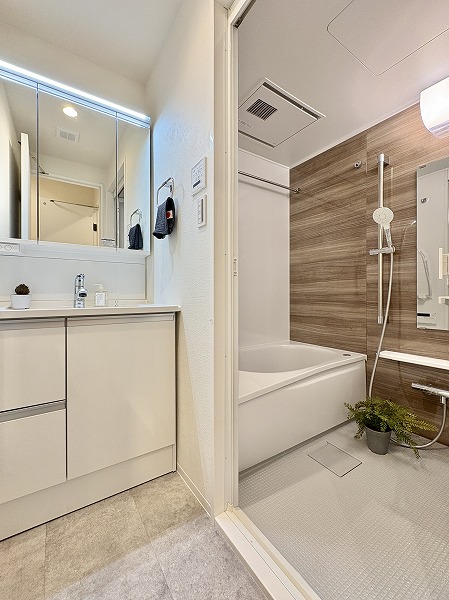 木目調パネルのバスルームは温かみのある落ち着いた雰囲気。シャンプーラック付きで洗い場がごちゃつかず、バスタブには追い焚き機能を完備。浴室乾燥機も搭載され、いつでも快適なバスタイムを楽しめます♡