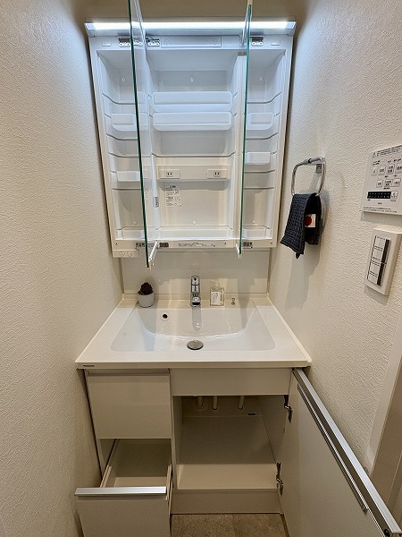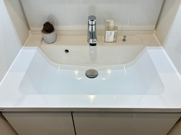 トイレや洗面台、洗濯機置き場が近接する動線設計で家事効率は抜群。洗面化粧台はミラーキャビネット仕様で歯ブラシや小物類をスッキリ収納できます。清潔感のある空間で毎日の身支度も快適です。