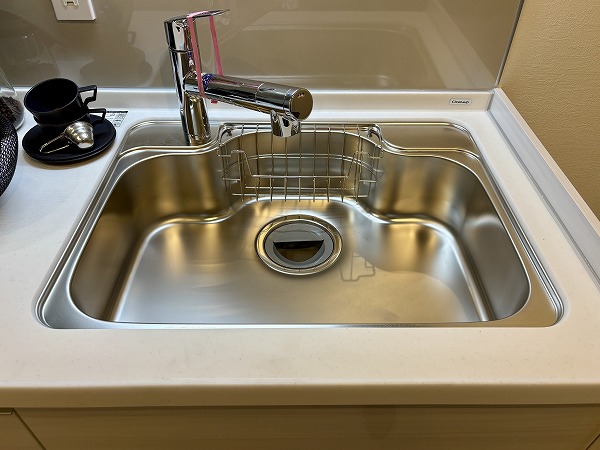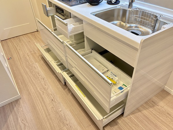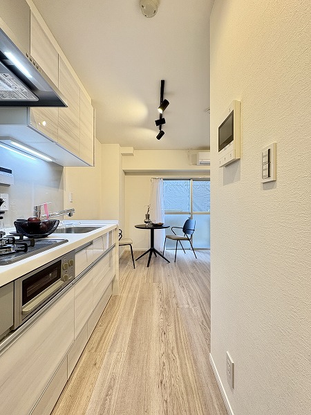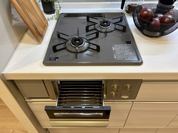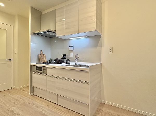 壁付タイプのキッチンは、煙やにおいがリビングに広がりにくい設計。上下に収納スペースを備え、常にスッキリした状態を保てます。やや小ぶりのワークトップながら大きなシンクとグリル付きコンロが備わり、効率よく料理を楽しめそうです♪