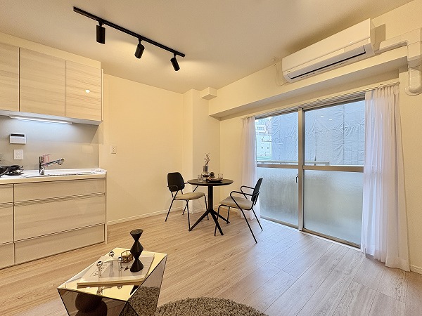 2階に位置する1LDKのお部屋。専有面積36.40㎡とコンパクトながら使い勝手の良い一室です。2025年10月にリノベーション済みで、新築のように美しい内装が魅力。明るいカラーリングで統一され、実際の広さ以上に開放感を感じられます。黒の3灯シーリングライトが空間のアクセントとなり、モダンでお洒落雰囲気を演出✧