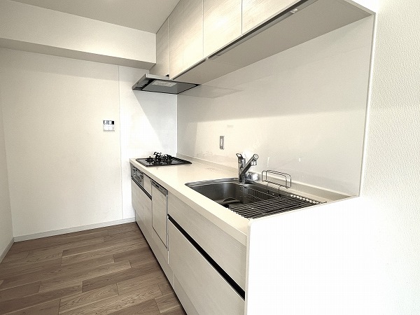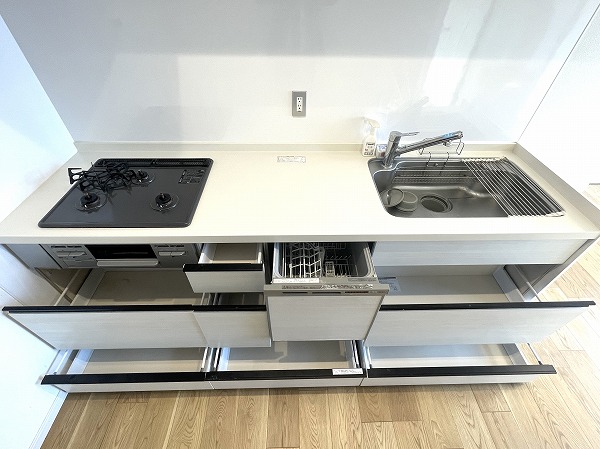 約3.0帖のシステムキッチンは、壁付タイプで集中力が高まります♪3口コンロにグリル付きと、お料理好きな方も満足していただける設備が整いますよ✧お片付けは食洗機にお任せして、趣味の時間を増やしちゃいましょう♡
