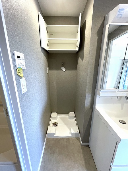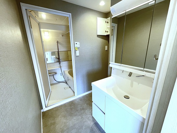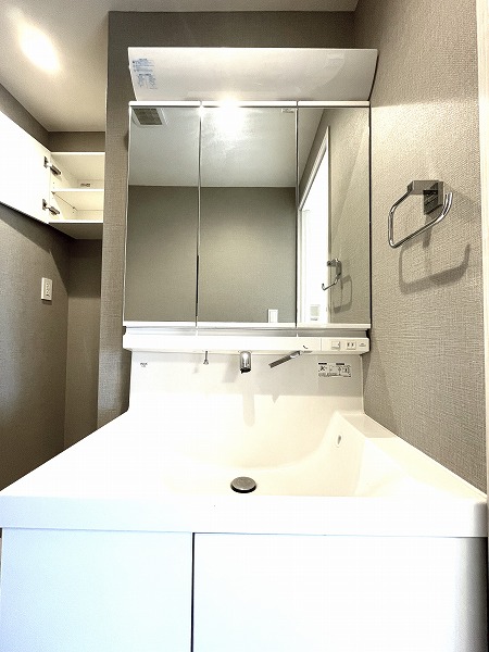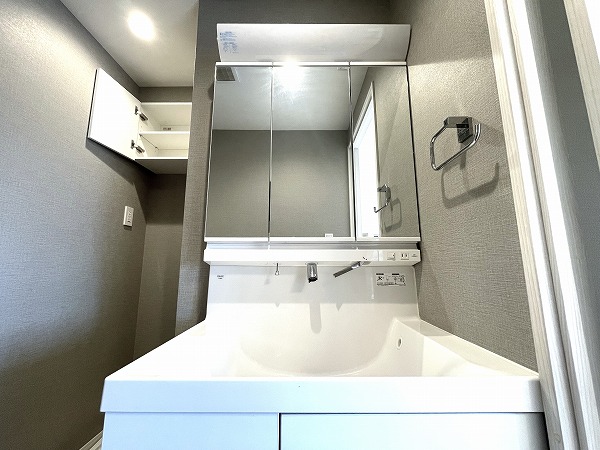 洗面化粧台はミラーキャビネット仕様で、細々とした洗面道具を整理整頓でき便利です◎同じ空間に洗濯機置き場があるので、洗濯物の予備洗いがしやすく、家事も捗りますね♪