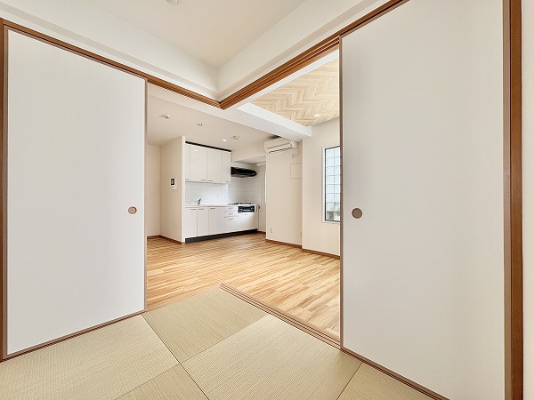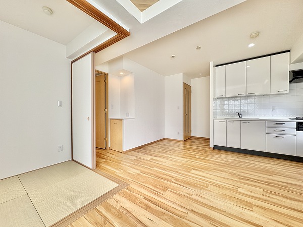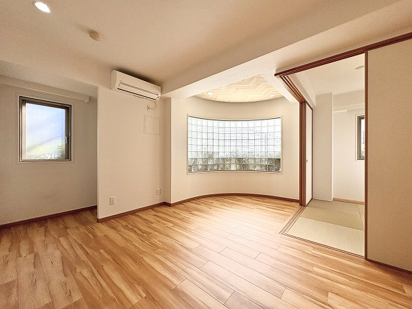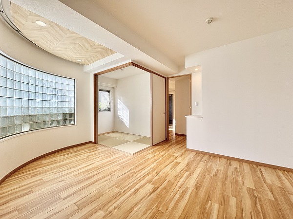『デュオ・スカーラ用賀』は用賀駅からたった2分の駅チカマンション!駅周辺に4軒のスーパー、ドラッグストア、100円ショップがあり、都市部へのアクセスも良好。圧倒的な生活利便性が自慢です♪今回は、スタイリッシュなデザインのエントランスを抜けた先に待つ1階住戸へ。内装の一部がリノベーションされた3LDKのお部屋です。リノベーションされた箇所はクロスとフロアタイル、バスルーム、洗面化粧台、キッチンやトイレの一部、畳、照明器具など。全面リノベーションではありませんが、現地で見ても綺麗な状態でした✧一番印象に残ったのはユニークな形状のリビングダイニングキッチンと正方形の畳が敷かれたミニ和室。ガラスブロックが埋め込まれたラウンド状の壁は南向きで、そのすぐお隣にある和室も明るい雰囲気です。透明なサッシと比べて光の入り方が優しく、プライバシー面も気にならないのが魅力的ですね。小さなお子様がいらっしゃる場合、ミニ和室をお昼寝スペースにするのも良さそうだと思いました◎ぜひ現地に足を運んでみてください! ライター:yuki【25L04】