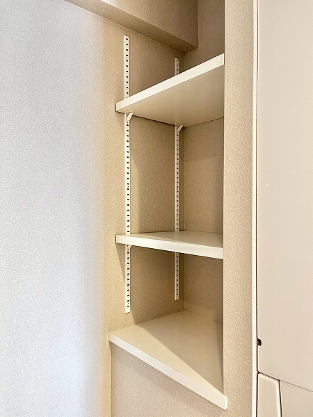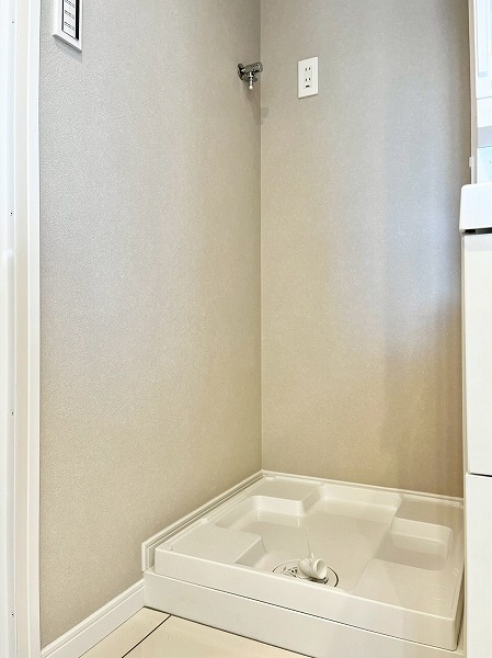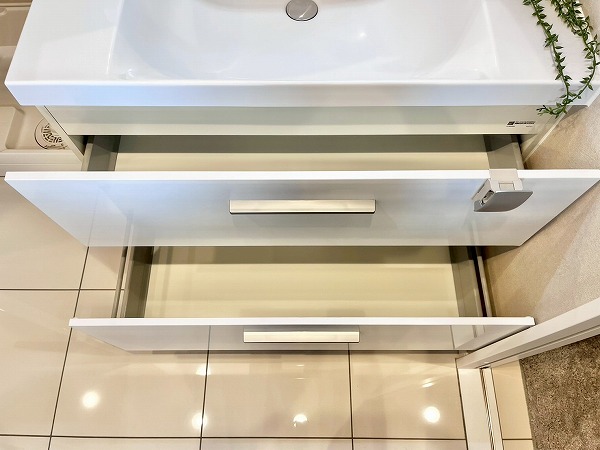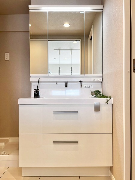水回りが集合したパウダールームへは、メインルーム内から出入り可能です。洗面化粧台を中心に、右手にはトイレ、左手にはバスルームが一直線に並ぶおかげで、生活動線がスムーズ。トイレ後の手洗いや、入浴→身支度の流れがストレスなく行えます。洗面化粧台下や洗濯機置き場横には、収納をたっぷりと完備◎