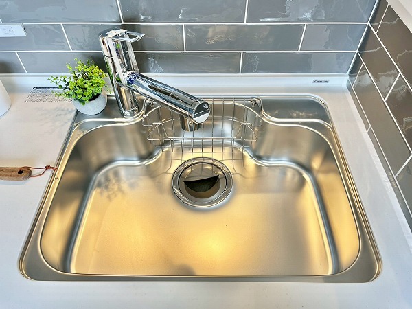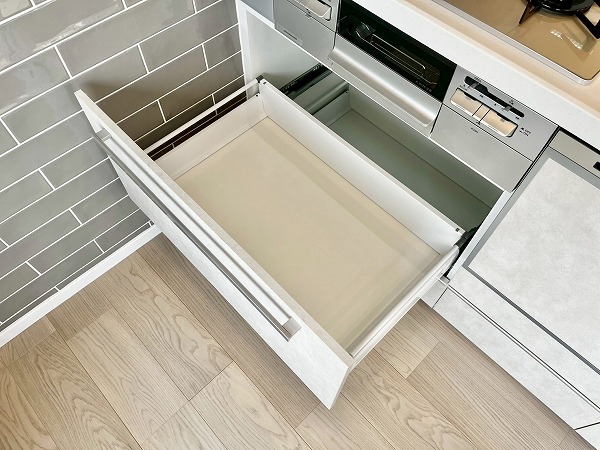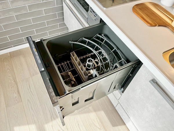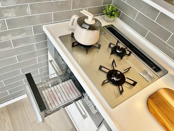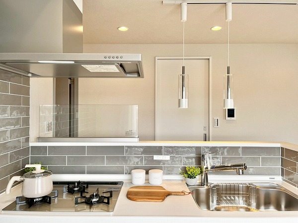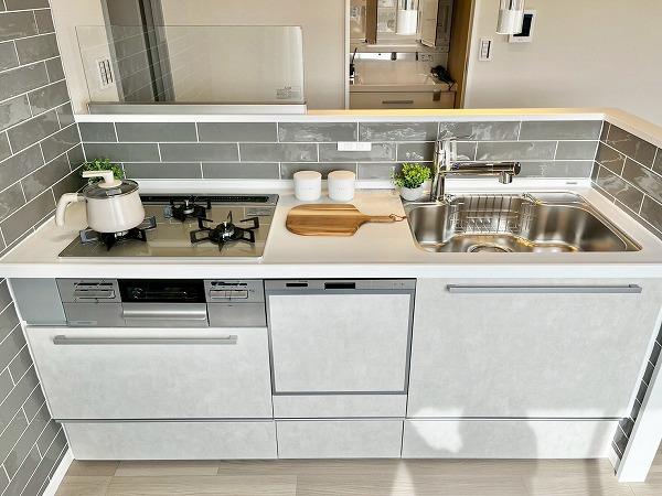 ダウンライトとグレータイルがアクセントとなったキッチン。背後に南向きの窓があるおかげで、明るく、清潔感溢れる環境でお料理を楽しむことができます。コンロの後ろには大きめの冷蔵庫も置けそうな余裕がありましたよ。グリル付き3口コンロ・食洗機・ワイドなキッチンシンクが完備され、機能面も充実◎