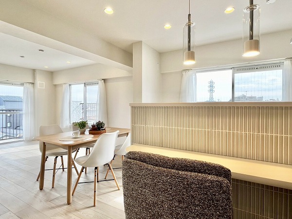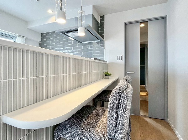 オープンタイプのキッチンと、対面に取り付けられたカウンターがアクセント。