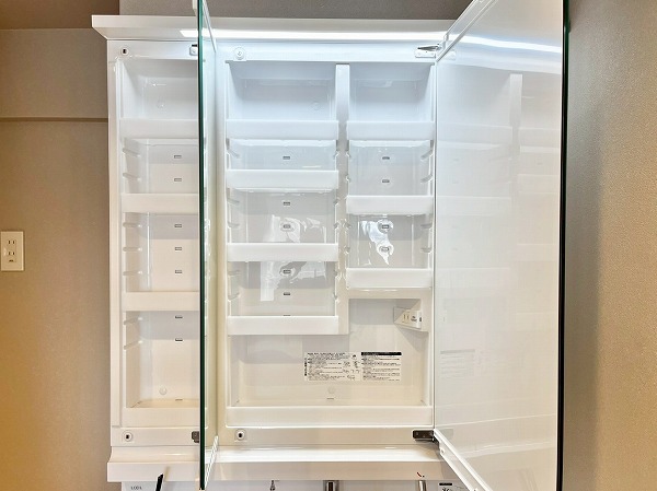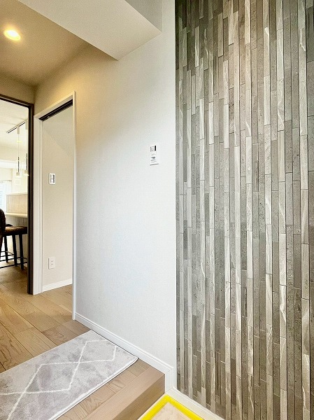 玄関を開けると、グレーの木目調の壁が現れ、涼しげなお部屋の顔を演出。玄関からお部屋の中が見えない造りで、宅配便や急な来客時にも安心です。右手に設けられたワイドな鏡を開けると、大容量のシューズボックスになっていました。狭さを感じがちな玄関周りのスペースが有効活用されています。