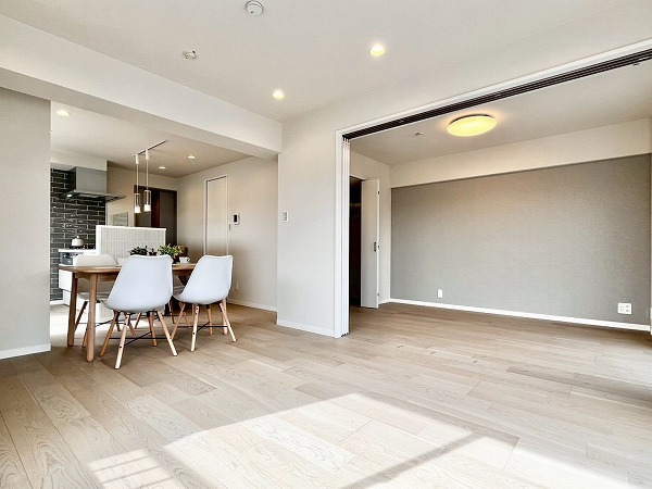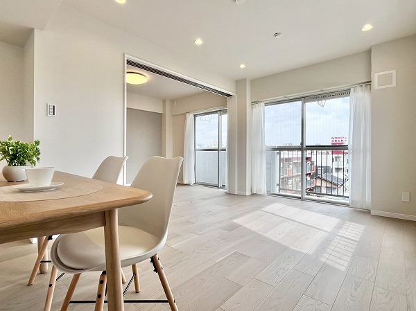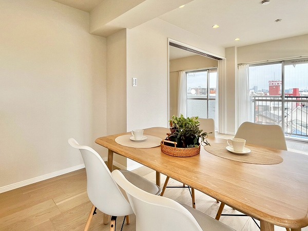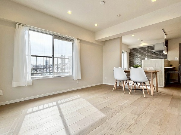 2LDKの最上階・角部屋のご紹介です!東と南に取り付けられた2方向の窓から太陽の光がいっぱいに差し込む、開放的な雰囲気が最大の魅力。リビングダイニングキッチンは14.4帖あり、ゆとりある空間です。今回ダイニングテーブルセット付きでのご案内ですが、そちらのチェアに座っても、ラグなどを敷いて直接床に腰を下ろしても、空を近くに感じる気持ちのいい暮らしが期待できそうですね。