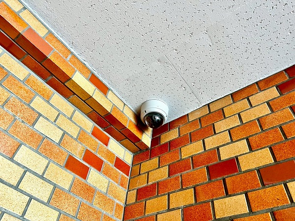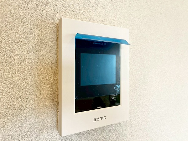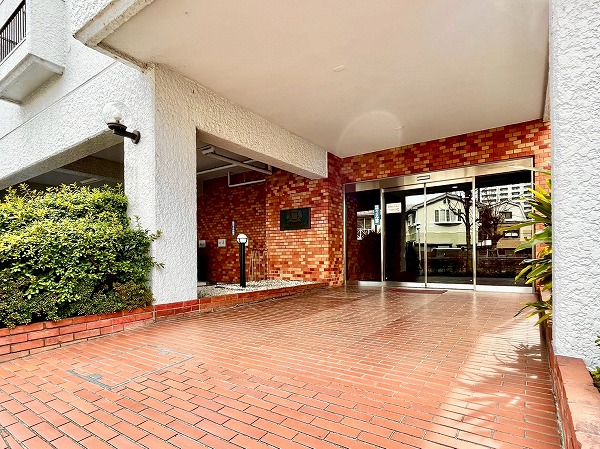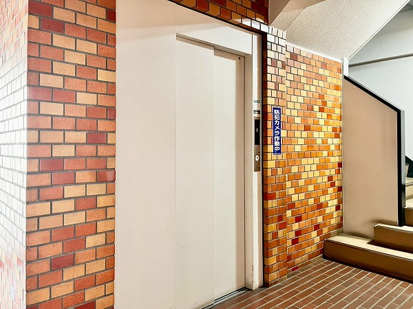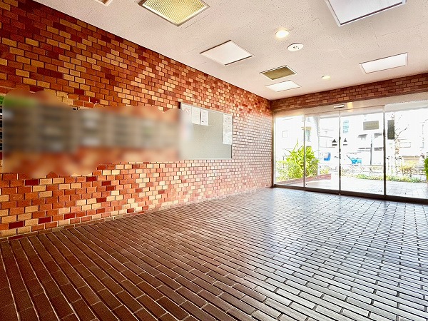 エントランスへ入ると、オレンジブラウンのタイルがお出迎えしてくれます。入り口には監視カメラがあり、出入りする人をしっかりとチェック。奥の扉は駐輪場へ、左へ曲がるとエレベーターがあります。ポストもエントランスに並んでいるので、チェックしてからお部屋へ✧