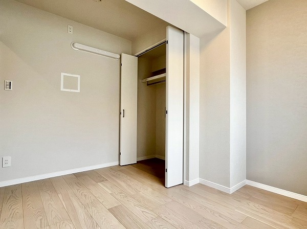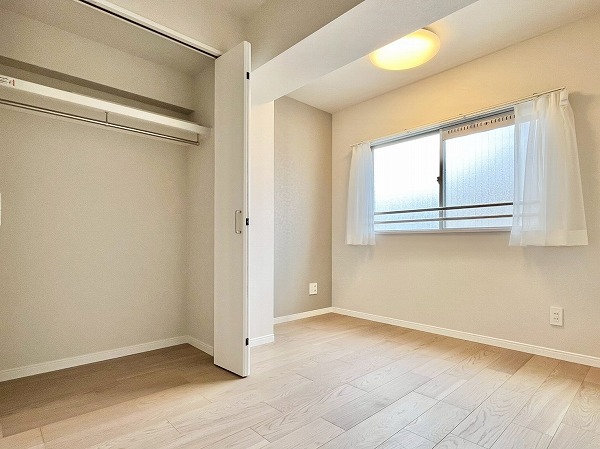 西向きの洋室。窓を開ければお部屋内へしっかりと風を通すこともできます。窓側のスペースがややくぼんでおり、シングルベッドが縦にぴったり入りそうなサイズ感です。全ての居室にクローゼットが付いているのがありがたいですね。