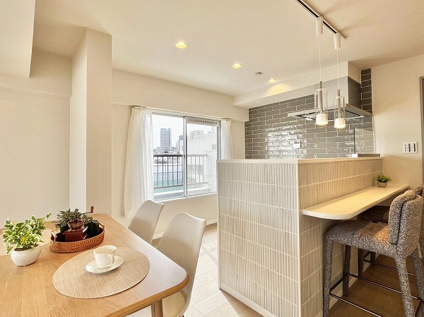 グレーの扉やキッチンのタイルが北欧スタイルを思わせるデザインで素敵です。オープンタイプのキッチンを中心として広がるダイニングスペースは、まるで海外のカフェのよう。休日にはコーヒーやサンドイッチをカウンターへとサーブして、ゆったりとした時間を楽しめます。