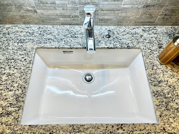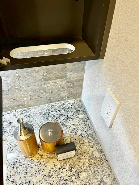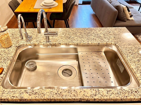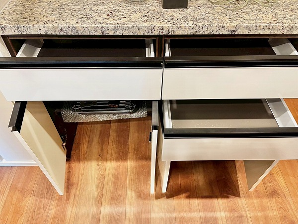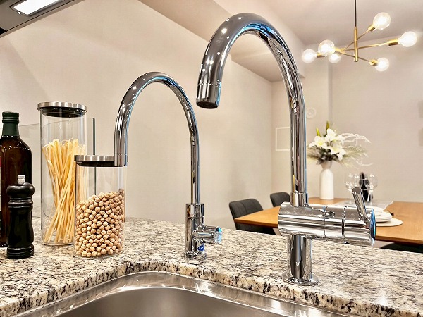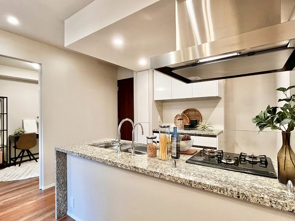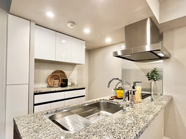 また、光沢のある扉のハンドルや大理石調のパネル、グラニット柄のワークトップなどデザイン面でも細部までこだわりが感じられました。