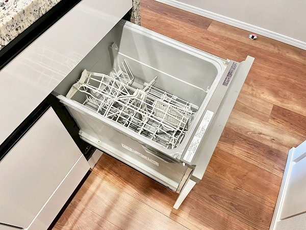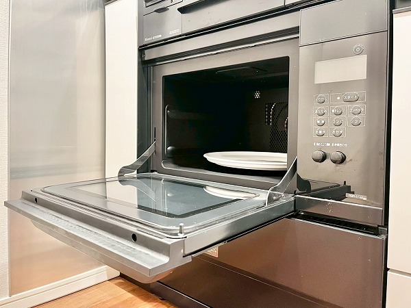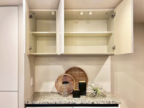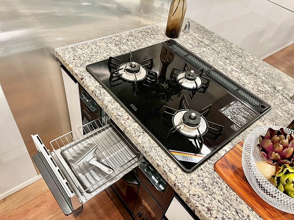 システムキッチンはオープンタイプを採用し、開放的。グリル付き3口コンロの下部にはオーブンまで付いており、挑戦できるお料理の幅がぐっと広がりますね。シンクにはディスポーザーを完備し、面倒な生ごみの処理はお任せです。背面にはキッチンとデザインを揃えたカップボードが設けられ、お皿や食器をたくさんしまえます。統一感と清潔感あふれる空間です。
