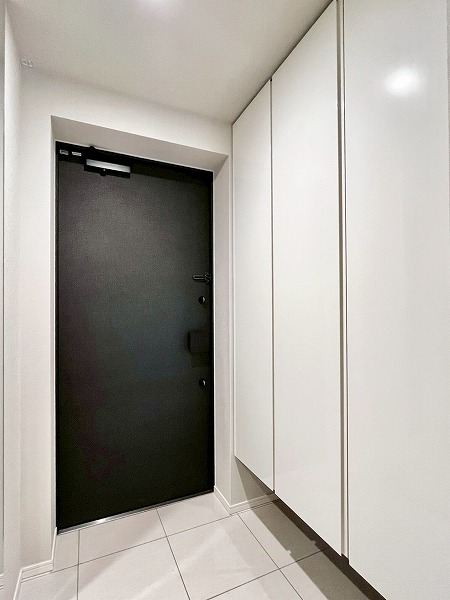 玄関ポーチは光沢のある床材をアクセントに、ホワイトでまとめられています。ポーチ→廊下へは段差を設けずシームレスに繋がっており、空間を広く見せるスタイリッシュな造りがポイントです。入って左手には大容量のシューズボックスが、右手にはワイドな鏡が設置され、シンプルながら充実の玄関周り。