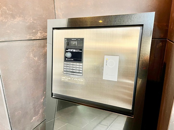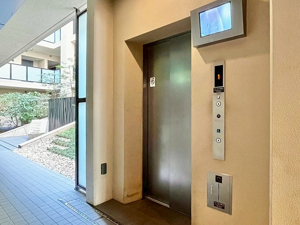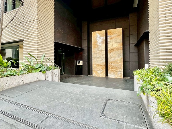 エントランスへ入るには、まずオートロックによる承認が必要。監視カメラも設けられており、セキュリティ面の心配はなさそうです。空調が管理され、上質な雰囲気が漂うエントランスを抜けると、エレベーターや駐車場への入り口が続いています。