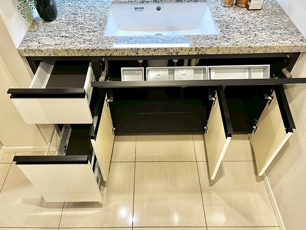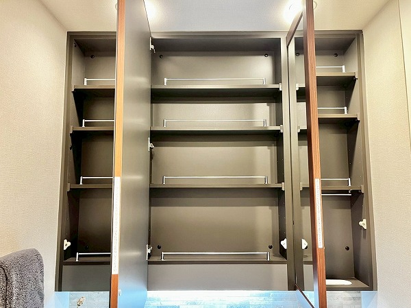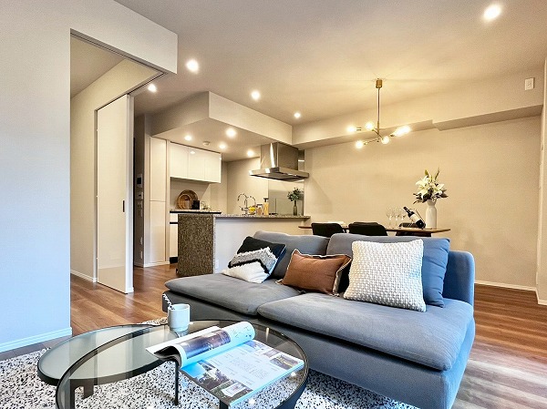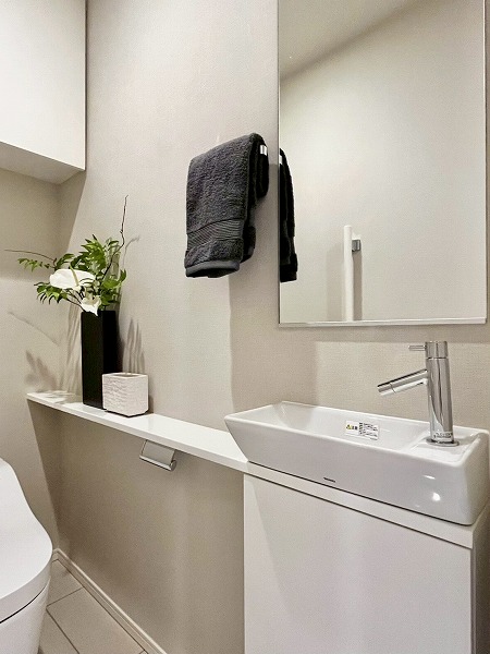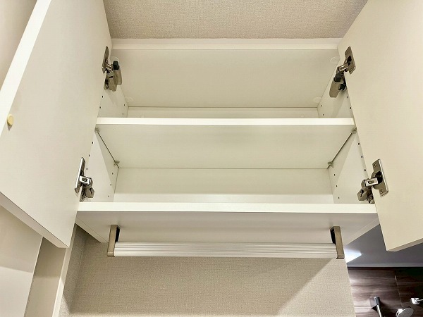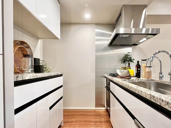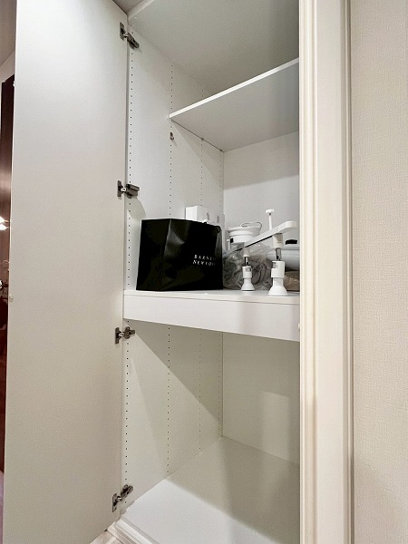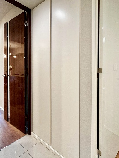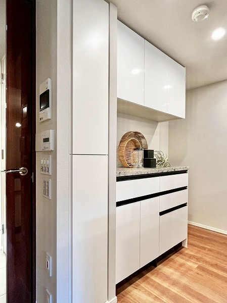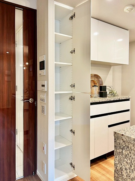 キッチン脇やパウダールーム内・廊下などのデッドスペースを逃さず収納が設けられており、実用性も兼ね備えられたお部屋です。