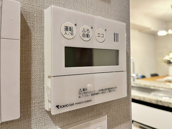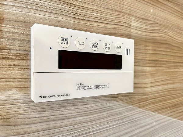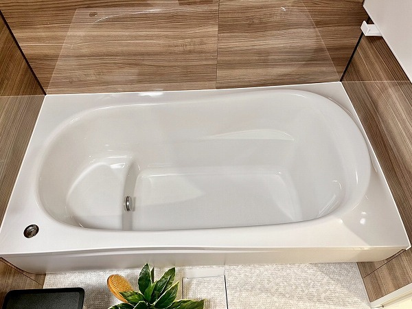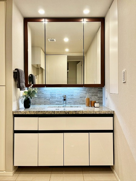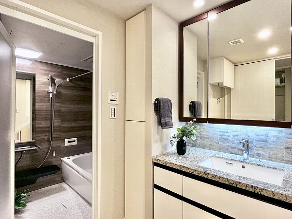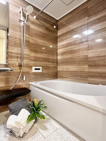 パウダールームは余裕を持たせた造りになっているのが特徴で、ちょっと座るのに便利なチェアなども置いておけそうでした。鏡を縁取る木材のフレームやグラニット柄のワークトップにデザイン性を感じる優雅な空間で、毎日の身支度もゆったり行えそうです。奥には浴室乾燥&追い焚き機能を備えたバスルームが続き、ご自分のお好きなタイミングでリラックスタイムをお楽しみいただけます。