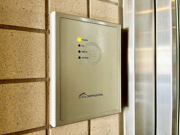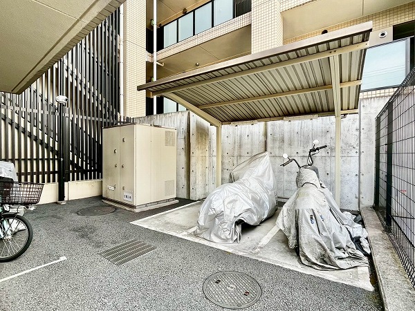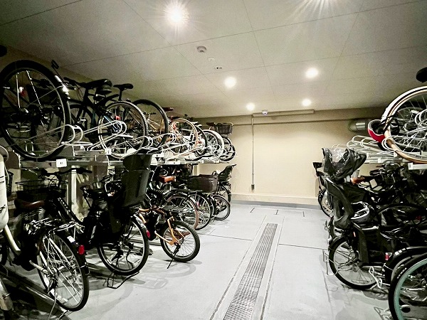 敷地内に設置された屋外駐車場です。ひとつひとつのスペースがしっかりと区切られ、停めやすく出しやすそうな配置です。駐車場内にはバイク置き場、屋内へ入ると駐輪場も完備されていました。どのスペースへ立ち入るにも鍵をかざす必要があり、外部の人間が立ち入らない安心の体制が整えられています。