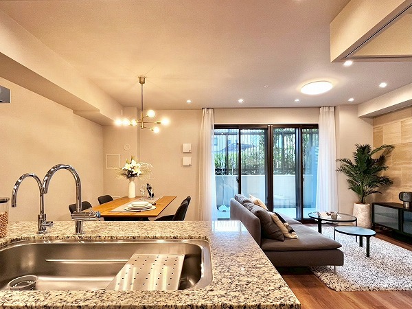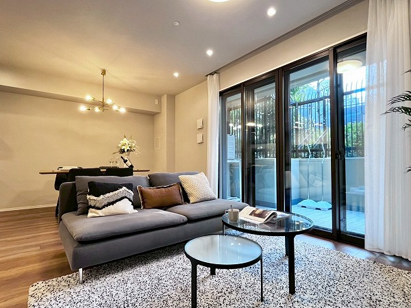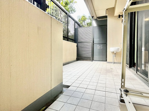 メインルームからは専用テラスに出ることができますよ✧かなり広々としており、ビーチチェアやサイドテーブルも置けそう。お気に入りの飲み物を片手に、ゆったりとくつろぐ休日も叶いそうです。わんちゃん・ねこちゃんも悠々と遊びまわれて大喜び。目の前に面した道路よりやや1段下がった造りになっており、人目はあまり気になりませんでした。