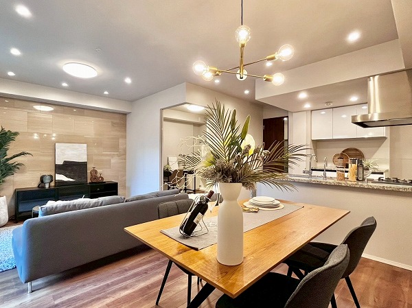 メインルームは、入って左側がキッチン&ダイニング、右側がリビングとゾーニングがしっかりしており、使用用途に応じて過ごすエリアを分けたい方におすすめ。ダイニングは壁に囲まれており、高級レストランのような落ち着いたお食事タイムが叶います。キッチンとの動線がよく、お料理をサーブしやすい造りです◎