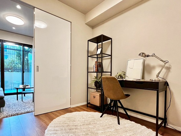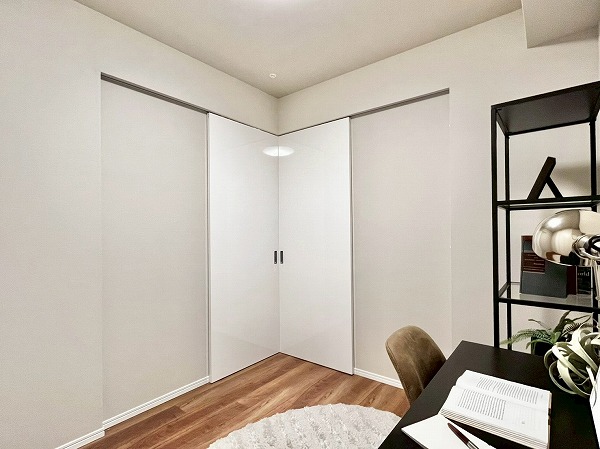 メインルーム内に設けられた洋室。壁面収納が充実しており、リビング雑貨の他に本の収納にも便利。デスクを置けば専用の書斎に早変わりです。引き戸で空間を締め切ることができるので、コンパクトな生活がお好みの方はこちらをベッドルームにするという使い方もよさそうですね。朝起きてすぐにメインルームにアクセスでき、身軽な生活に。