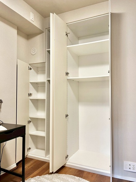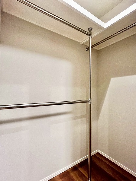 廊下から出入りできるサービスルームはおよそ6.5帖あり、ゆったりサイズのベッドルームとしてお使いいただけます。メインルームとは離れているため、家電などの音を気にせず睡眠に集中できる、完璧な環境です。お洋服やバッグは2段式のウォークインクローゼットにしまうことで、起床→身支度の流れがお部屋内で完結する使いやすさが魅力的ですね。