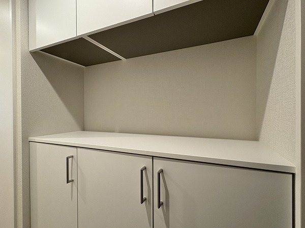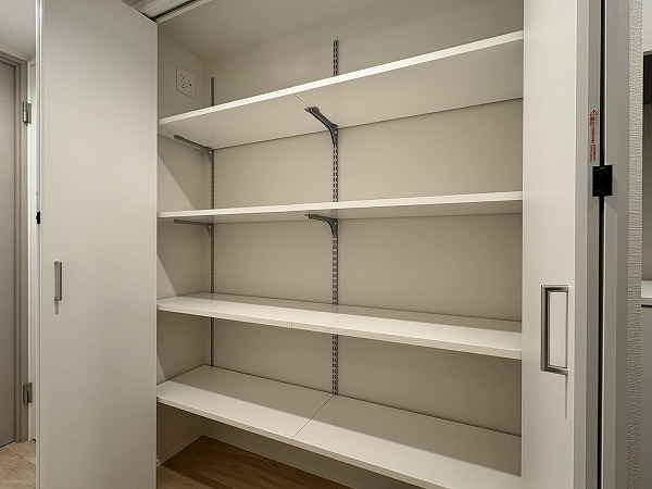 廊下には便利な可動式の収納がありました✧かさ張りやすいアウトドア用品や備蓄品、災害時の非常食などはこちらの収納へ。玄関を上がってすぐの場所にあるのが非常にありがたい、便利な収納です。