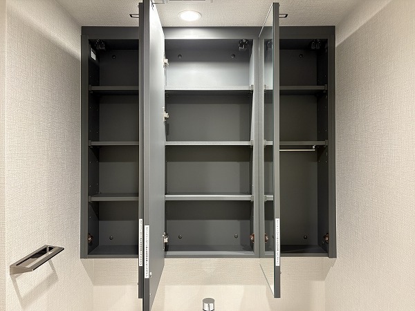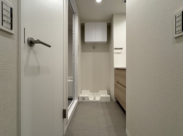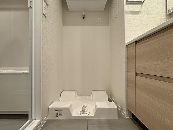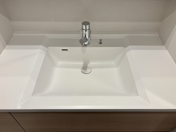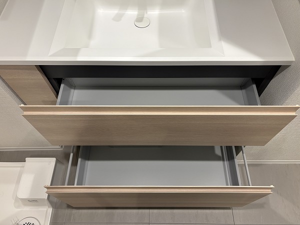 洗面台も床と同じ温かい木目調で、色味が柔らかく優しい印象☀洗面ボウルはゆとりがあり、朝の忙しい時間もストレスフリーな身支度が行えます。明るい照明はメイクや身だしなみを整える際に非常に便利。清潔感を保ちやすいのもメリットです。