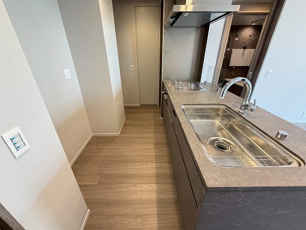 おおよそ3.7帖のキッチンスペースには、シンプルで使い勝手の良いシステムキッチンを完備。複数品の同時調理が可能なグリル付き3口コンロ、便利な食洗機、浄水器を搭載しているので、毎日の家事もスムーズに捗りそう♪背後のドアからは、バルコニーにも出られます。