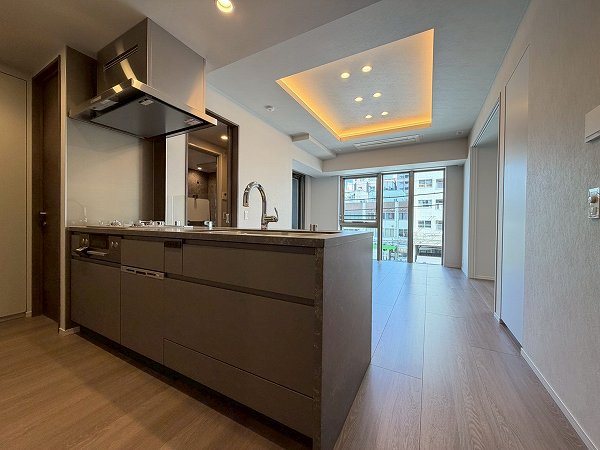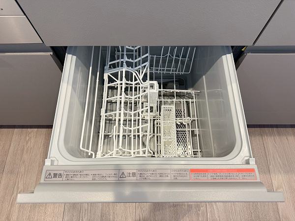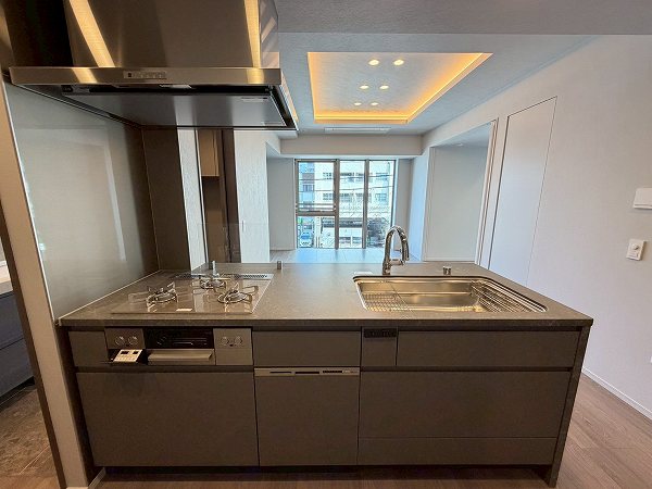 スマートなオープンキッチンには食洗機が搭載され、時間の節約に一役買ってくれます。おしゃれなコンロとJ字の水栓がお部屋の雰囲気に品をプラス。背面の収納棚には普段使いのお皿から特別な日のグラスまで、美しく収納できます。