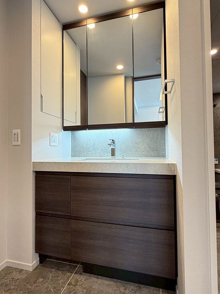 フレームレスの鏡が空間に溶け込み、スタイリッシュに仕上がったパウダールーム。ライトが手元を照らし、上品な造りに魅了されます。左側にはタオルや日用品のストックの保管に便利なリネン棚が設けられ、実用性もしっかり兼ね備えた完璧な仕様。
