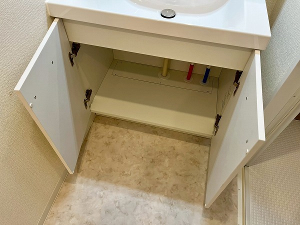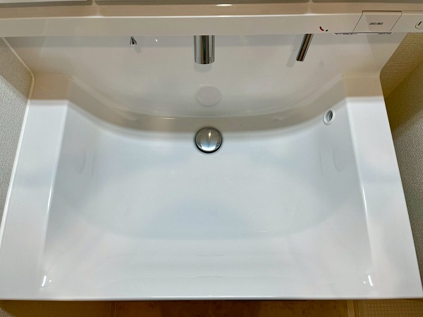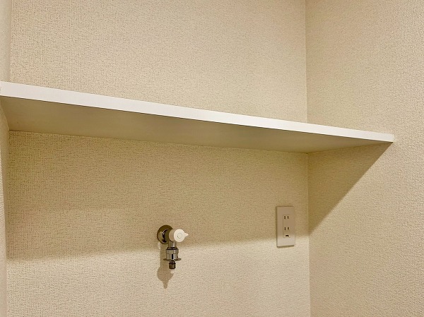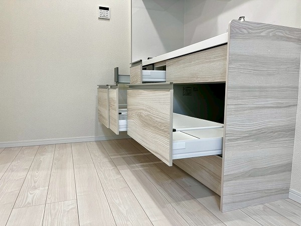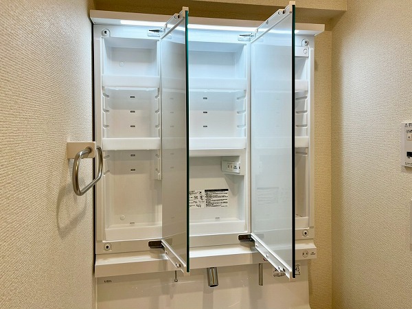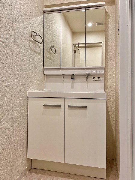 水回りが使いやすくまとまったパウダールーム。洗面台に付いたライトがお顔を照らしてくれ、身支度がぐっとしやすくなりますね。鏡裏の収納スペースに歯ブラシやスキンケア用品をしまっておけば、整頓された洗面周りを維持できます。