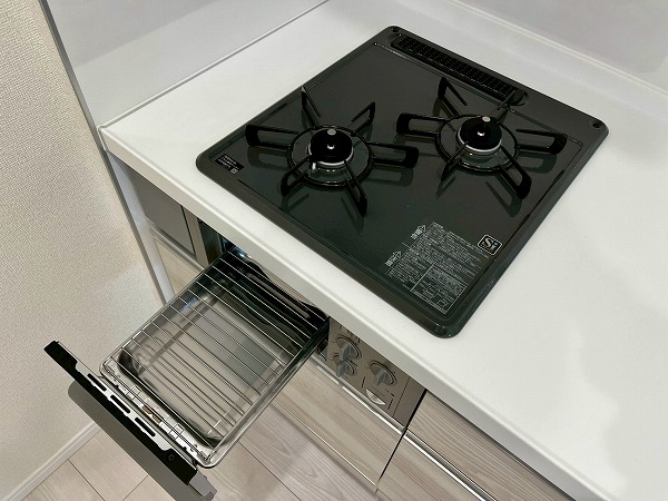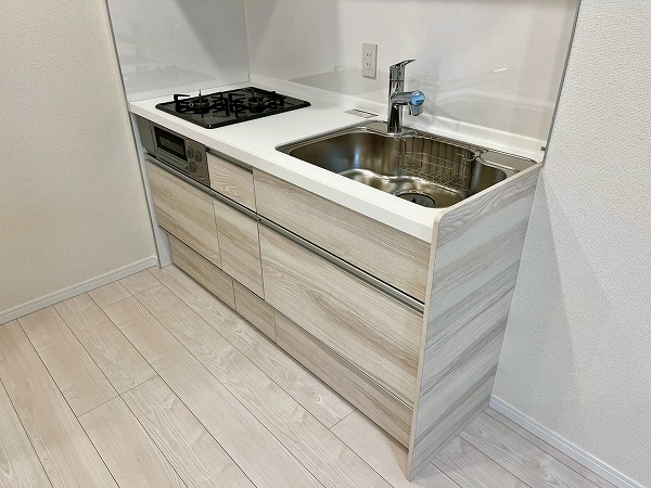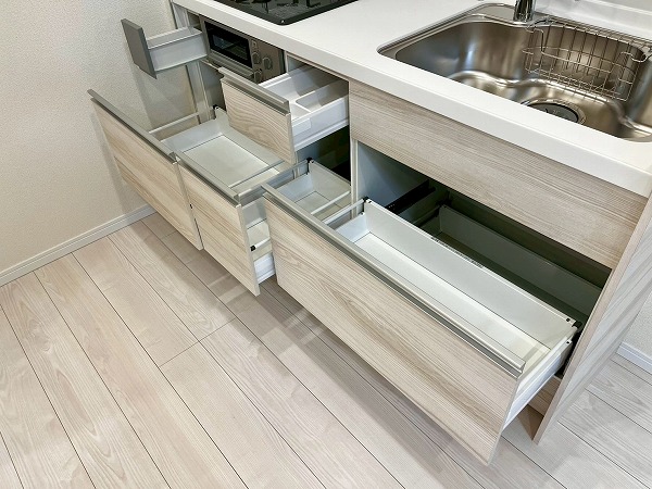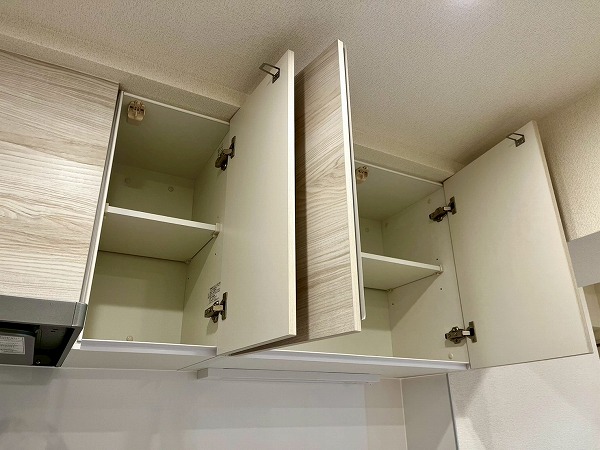 壁付きのキッチンは背面のスペースに余裕があり、使いやすさ◎大きな冷蔵庫を置いても圧迫感がありません。サイズ違いのフライパンやボウルなどはシンク下に、出番の少ない大きめの調理器具は上部の棚にしまっておけそうです。
