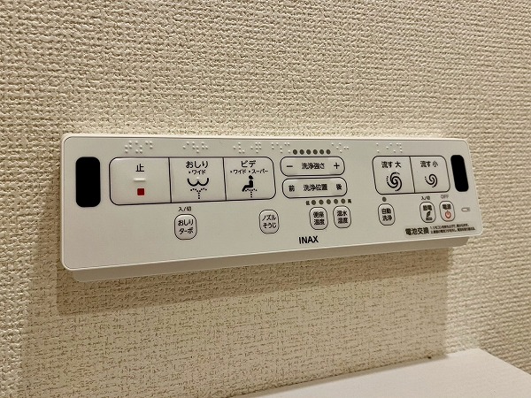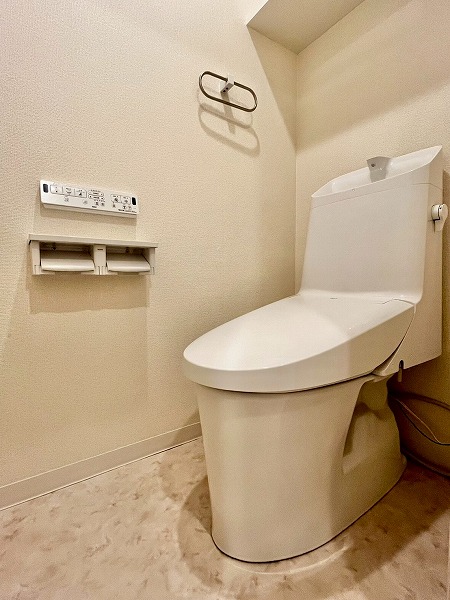 温水洗浄便座付きのトイレは、ダイニングキッチンのドアを開けてすぐの場所にあります。お部屋のどこからでもアクセスしやすい位置にあるのはありがたいですね。トイレットペーパーホルダーが2個ついて、ストックしておけるのが便利。