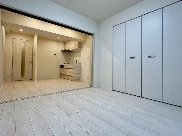 かつて一世を風靡したテレビドラマのロケ地「恵比寿ガーデンプレイス」よりほど近い場所に建つ『シャンボール恵比寿』。レンガ色の外観が目を惹く11階建てのマンションです。こちらのお部屋は8階に位置した単身向けの1LDK。白をベースに木目調が使われた内装が非常に美しく、それでいてユニークな造りとなっています。玄関に入るとすぐ右側にはベンチが付いていました。室内廊下はありませんが、玄関と居室の間に扉があるので、こちらを閉めておけば宅配業者などの対応時もプライバシーの心配はありません。玄関の先に広がるのは約8.6帖のリビングダイニングキッチンと隣接するベッドルーム。向かって左側には木目調のシステムキッチンとテレビボードがひと続きに設置されています。居室とキッチン&テレビボードの一体感が高く、全体を通してデザイン性の高い仕上がりです✦洋室との間には木目の縁が付いた透明な仕切り扉が。これなら扉を閉め切っても光を通し明るい空間を保てますね。恵比寿エリアで1人暮らしをご検討中の方、ぜひ現地へ足を運んでみてください。 ライター:yuki【25G08】