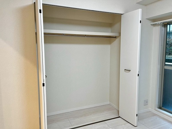 洋室は約5.6帖。ベッド・デスクなどを配置しやすい、正方形に近い形のお部屋です。両開きの収納は出しやすく、奥行きや高さが確保されて使いやすい造りになっています。生活感の出るものは全てここにしまえば、整理整頓されたお部屋で暮らせますね。