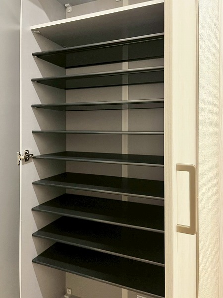 玄関には人感センサーライトを設置し、暗い中電気スイッチを探す手間を解消。ドアを開けてすぐに明かりがあると、ほっとしますよね。玄関脇には大容量のシューズラックを設置しているので、靴をたくさんお持ちの方でも安心です。